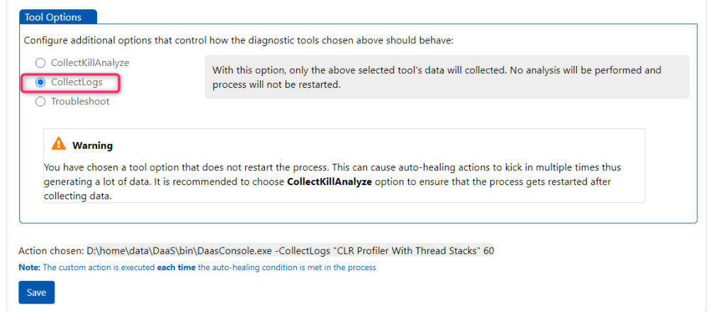 If you select “CollectKillAnalyze” please note that the web app will be restarted. I recommend that you select “CollectLogs” only.