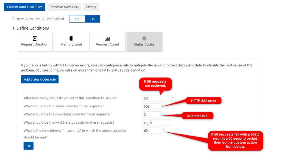 Azure auto heal is a powerful tool that can be used to mitigate and capture vital information for any issues that may occur with your web applications. Every web app will eventually encounter some kind of issue, slowness, downtimes and the dreaded “intermittent issue”. With auto-heal you can mitigate the problem and even gather additional information to further troubleshoot any problem. In this post I’m going to show you how to configure custom auto-heal rules to capture a CLR profile if HTTP 502.3 errors are encountered.