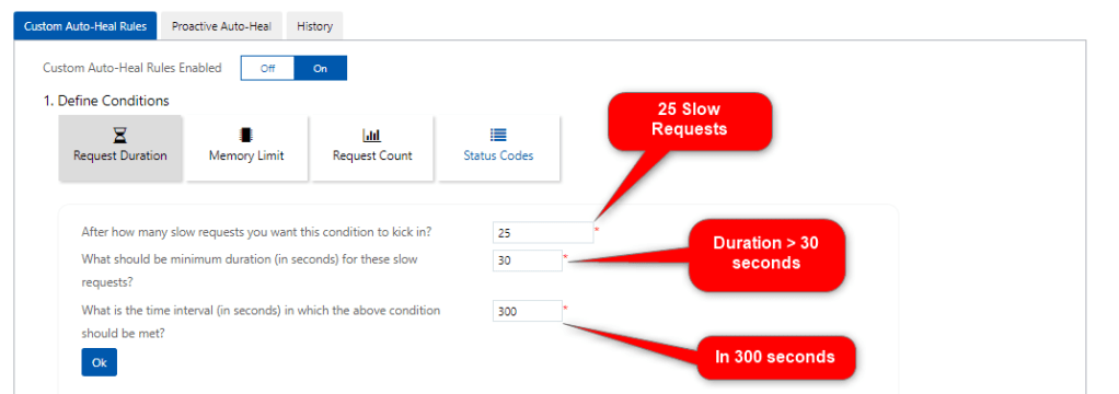 I’m setting the rule to check for Slow Requests(25) that take > (30) seconds in a 5 minute window.